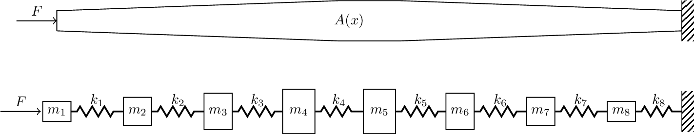 So far we have covered, in reasonable detail, the dynamics of single and two DoF mass-spring systems. Whilst some physical systems accept this simple representation, for example isolated machinery or the vented loudspeaker, most require models of much greater complexity, including many DoFs. Indeed, real systems with distributed physical properties (mass/stiffness) are said to have \(\infty\) DoFs. Using techniques such as the Finite Element Method we are able to approximate such contiuous systems by lumping together mass and stiffness behaviour to form finite number of DoFs. An example of this is shown in Figure 1, where a continuous rod with varying geometry is approximated by a discrete mass-spring system.