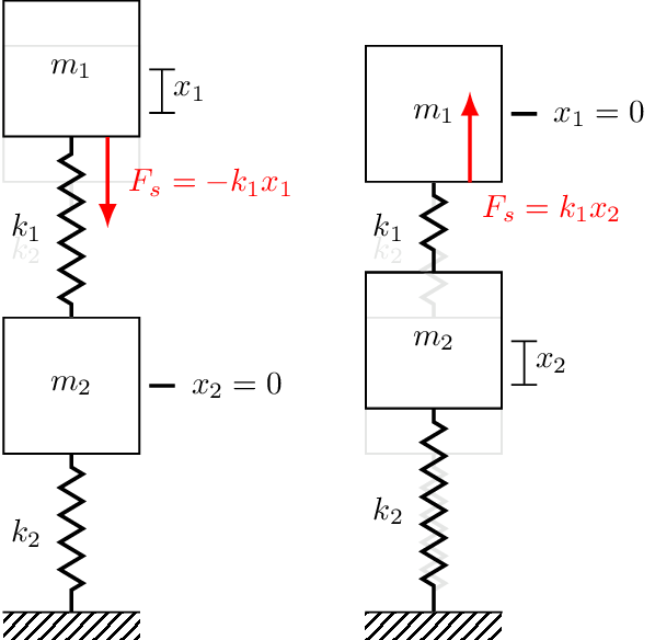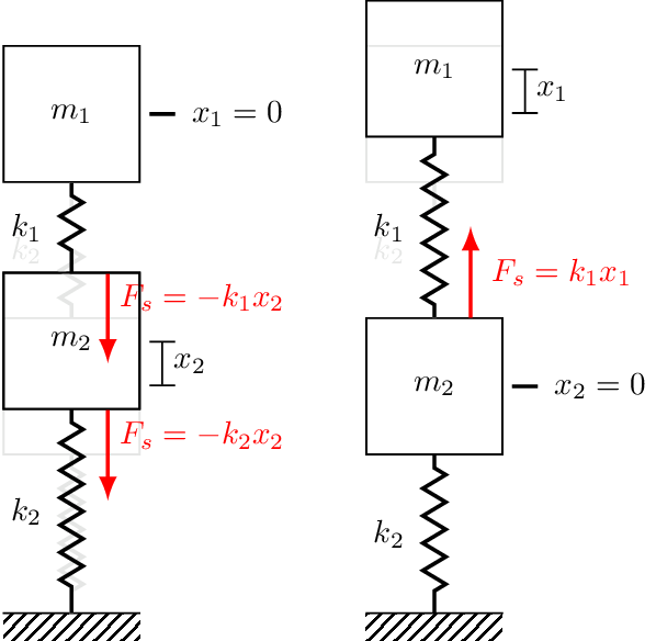 We can now repeat this process for mass 2 using Figure 3. We first displace mass 2 and observed that both \(k_1\) and \(k_2\) develop forces that push/pull mass 2 downwards. Each spring contirbutes a force, and so the total force is \(-k_1 x_2 - k_2 x_2\). Next we displace mass 1 upwards, which generates an upwards pulling force on mass 2, \(k_1x_1\). Now Newton’s 2nd law for mass 2 is, \[ \begin{align} m_2\ddot{x} _2&= \sum_i F_i\\ &= F_{e_2} -k_1x_2 - k_2 x_2 + k_1 x_1 \end{align} \] and its EoM is given by, \[ \begin{align} F_{e_1} &= m_1\ddot{x}_1 + k_1 (x_2-x_1) + k_2 x_2\\ & = m_1\ddot{x}_1 + (k_1+k_2)x_2 -k_1x_1 \end{align} \]
