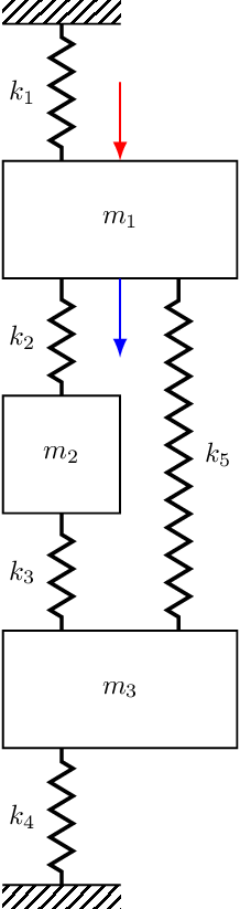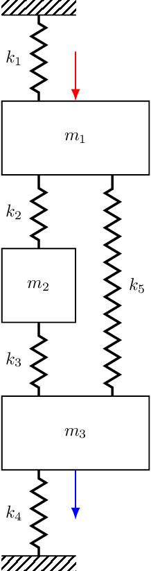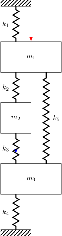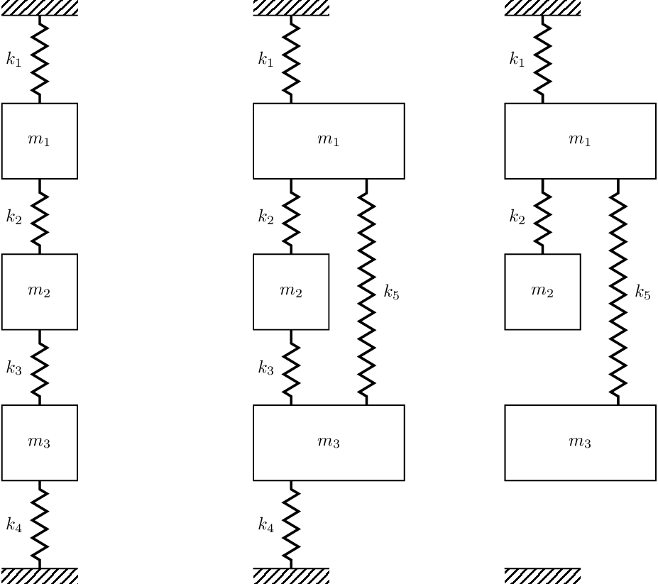 The exact same notion can be applied to the damping terms and used to build \(\mathbf{C}\). As said before, for a discrete mass-sopring system the mass matrix is just diagonal with the mass of mass \(n\) in the \(n\)th diagonal of \(\mathbf{M}\). In case you need a little more convincing, shown in Figure 4 are three different 3-DOF systems, the sitffness matrices for which are given by, \[ \mathbf{K} = \left[\begin{array}{c c c} k_1+k_2 & -k_2 & 0 \\ -k_2 & k_2+k_3 & -k_3 \\ 0& -k_3 & k_3+k_4 \\ \end{array}\right], \quad \left[\begin{array}{c c c} k_1+k_2+k_5 & -k_2 & -k_5 \\ -k_2 & k_2+k_3 & -k_3 \\ -k_5& -k_3 & k_3+k_4 +k_5 \\ \end{array}\right], \quad \left[\begin{array}{c c c} k_1+k_2+k_5 & -k_2 & -k_5 \\ -k_2 & k_2 & 0 \\ -k_5& 0 & k_5 \\ \end{array}\right] \tag{2}\]
