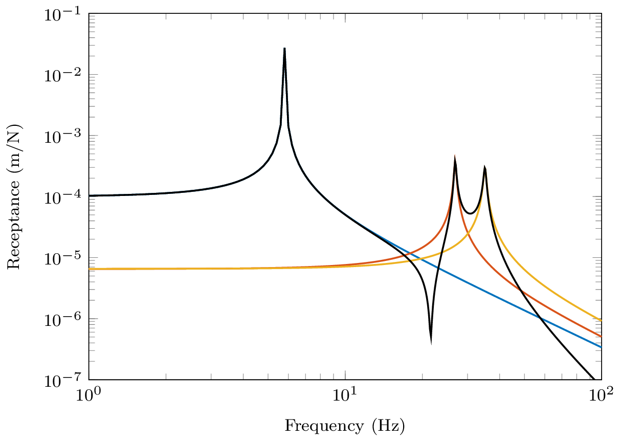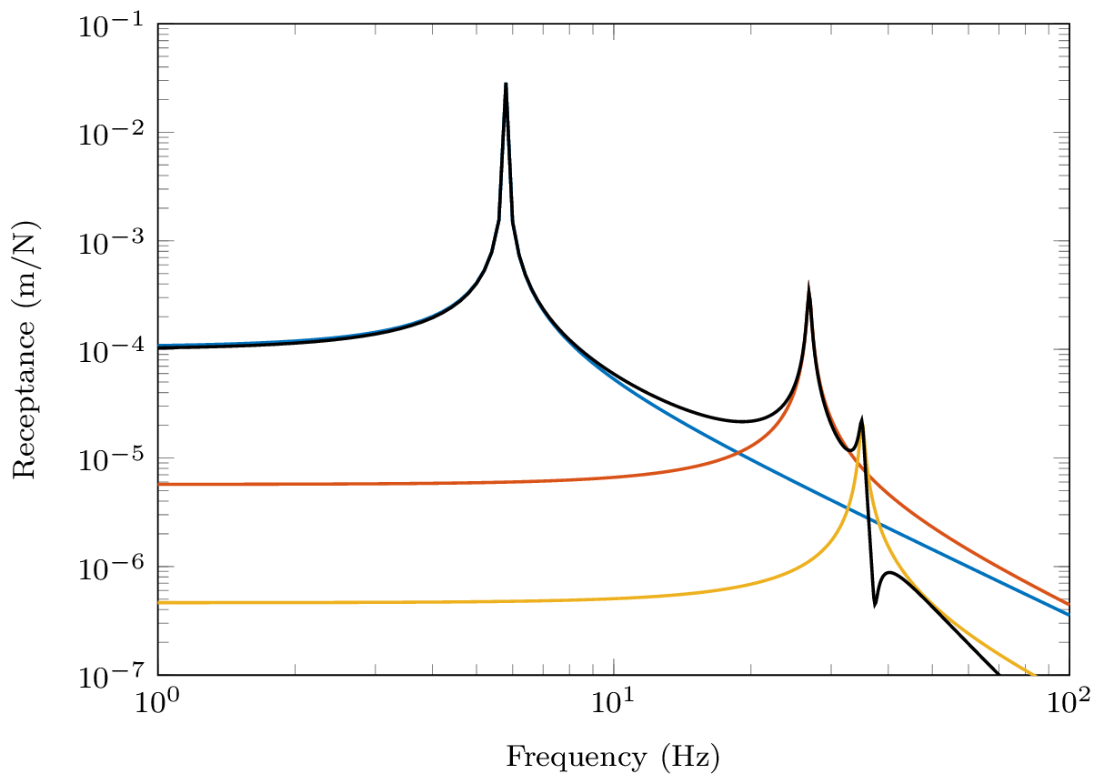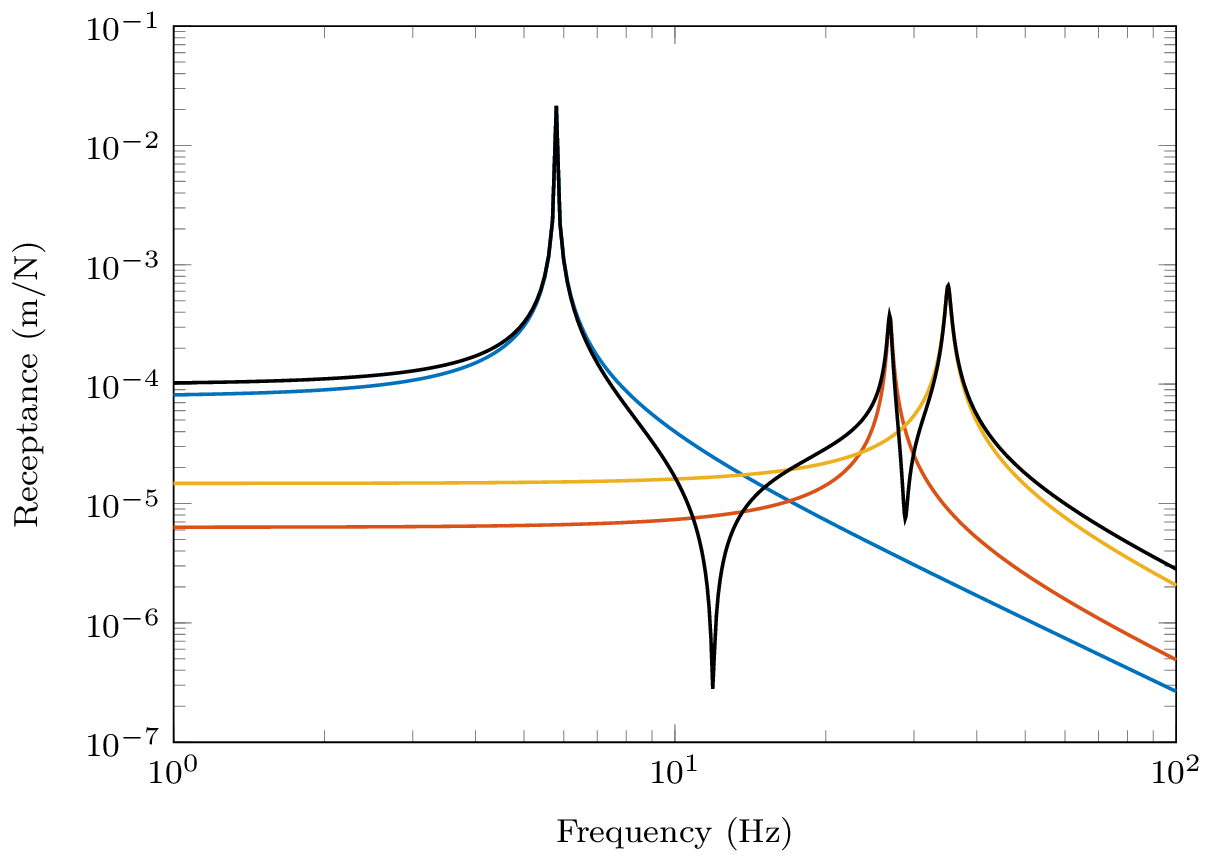 Since all the numerators are positive in \(R_{11}\) we further conclude that an anti-resonance must occur between every pair of resonances, that that this is true for any receptance with co-located excitation and response, \(R_{nn}\). The FRFs in Figure 6 illustrate exactly this.