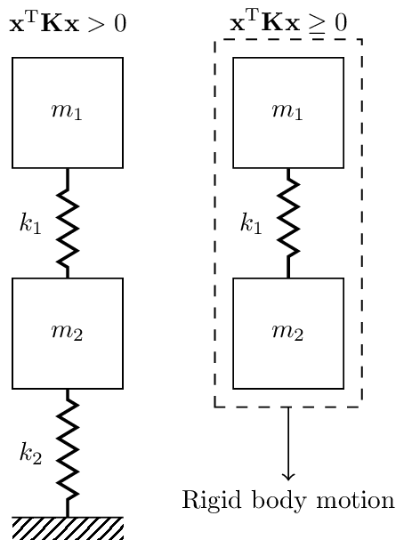 Similarly, \(V\) should always be positive or zero for a given displacement \(\mathbf{x}\). That is, for any displacement vector \(\mathbf{x}\), we should have that \(\mathbf{x}^{\rm T} \mathbf{K} \mathbf{x}\geq 0\). A matrix that satisfies this inequality is said to be positive-semi-definite. A positive value indicates that a deformation of the system which incurs some potential energy. A zero value suggests that there is some set of displacements \(\mathbf{x}\) that does not cause any deformation of the system, hence zero potential energy. This occurs when the system is not rigidly constrained and is able to move entirely as a single rigid body. An example of this is illustrated in Figure 5.