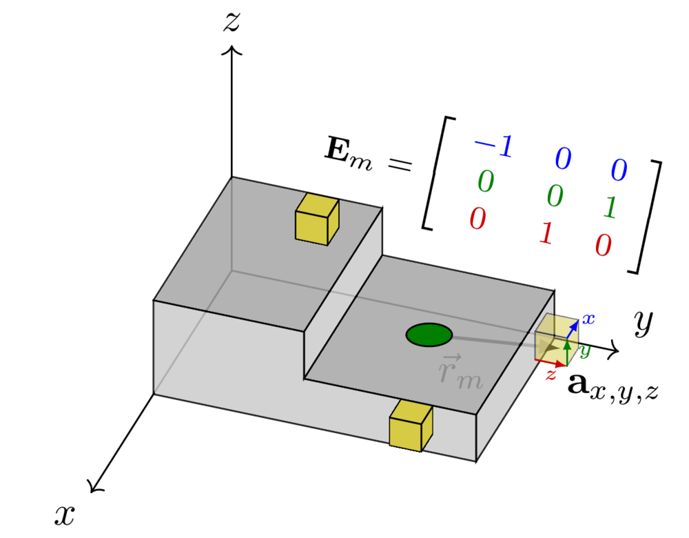 To construct the transformation matrix \(\mathbf{T}_v\), the spatial locations and orientations of the sensors with respect to the virtual point must be accurately defined. In practice, it is common to use three triaxial sensors arranged around each virtual point, providing a total of nine translational measurements. For each sensor (say, sensor number \(n\) shown in Figure 2) a local transformation matrix \(\mathbf{R}_v^n\) that accounts for its position and orientation relative to the virtual point can be constructed as, \[