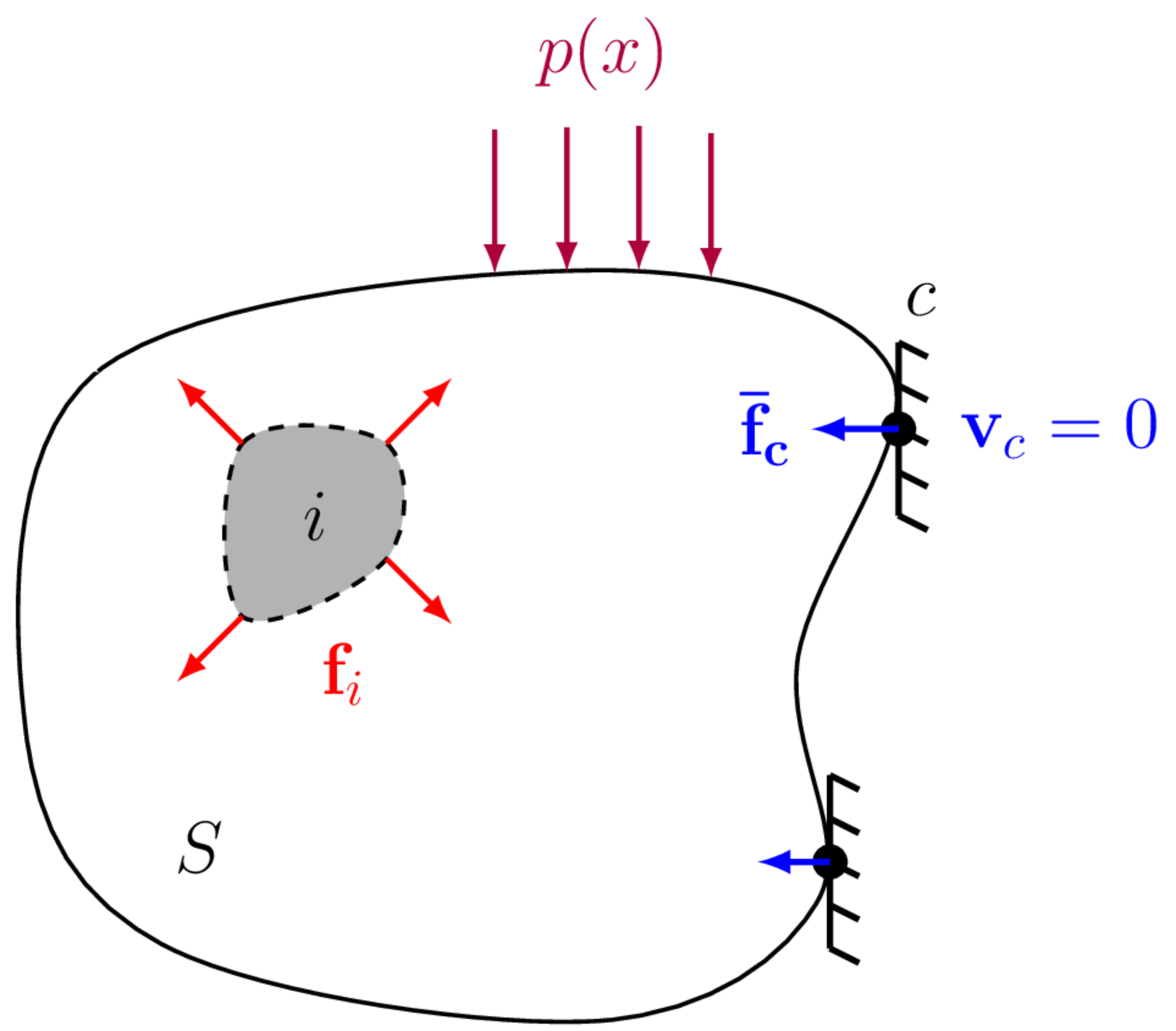 Figure 1: Illustration of blocked force. \(\mathbf{f}_i\) and \(p(x)\) represent internal forcing and distributed loading over the source. \(\mathbf{\bar{f}}_c\) is the blocking constraint force required to satisfy the rigid constraint \(\mathbf{v}_c = \mathbf{0}\).