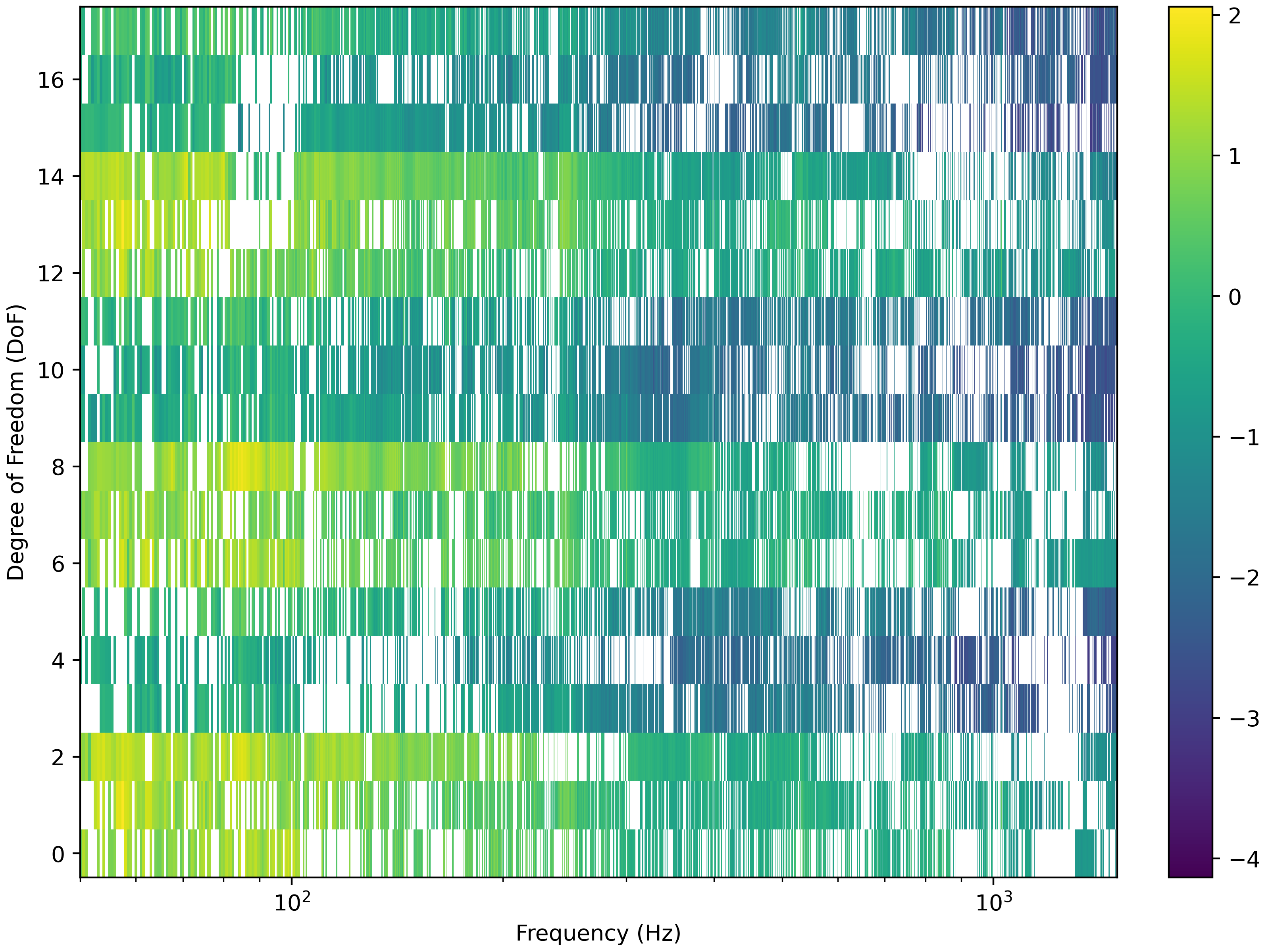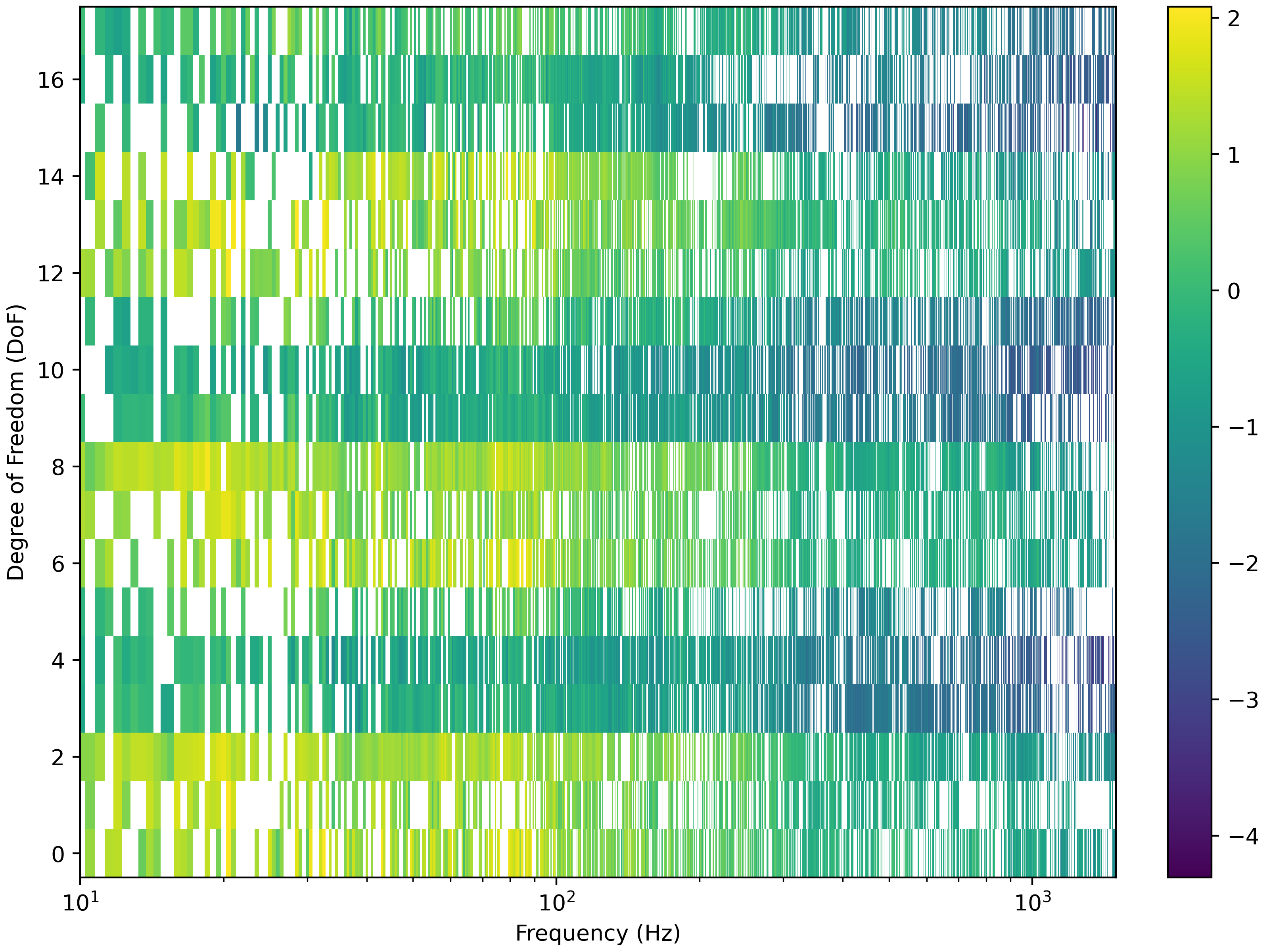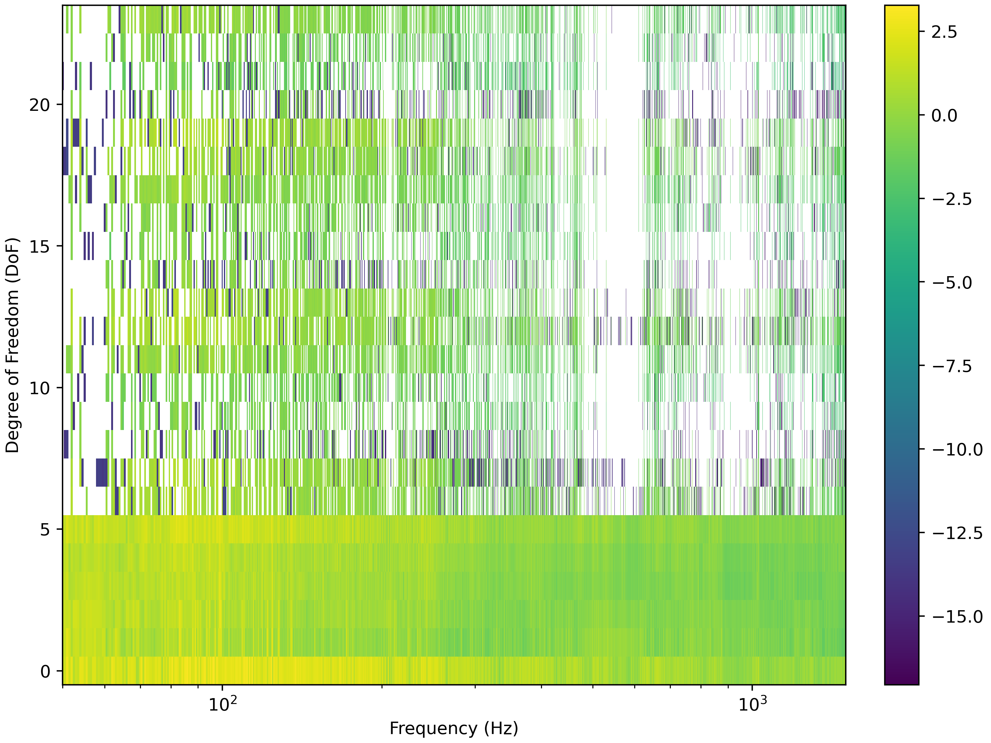 We see that in both cases a sparse solution is obtained in preference to a ‘full’ solution, though the resulting sparsity patterns differ greatly. Inspecting the I-VP forces, we see a slight increase in sparsity in the low frequency range, likely on account of the rigid-body dynamics being dominant in this range. In the mid-high frequency range the forces, though remaining somewhat sparse, behave erratically ‘turning on and off’ rapidly over frequency with little to no identifiable trends. Lastly, we see that across the majority of the frequency range, the \(z\) DoF of each VP is kept active. This is expected as the main excitation mechanism of the source acts in this direction.