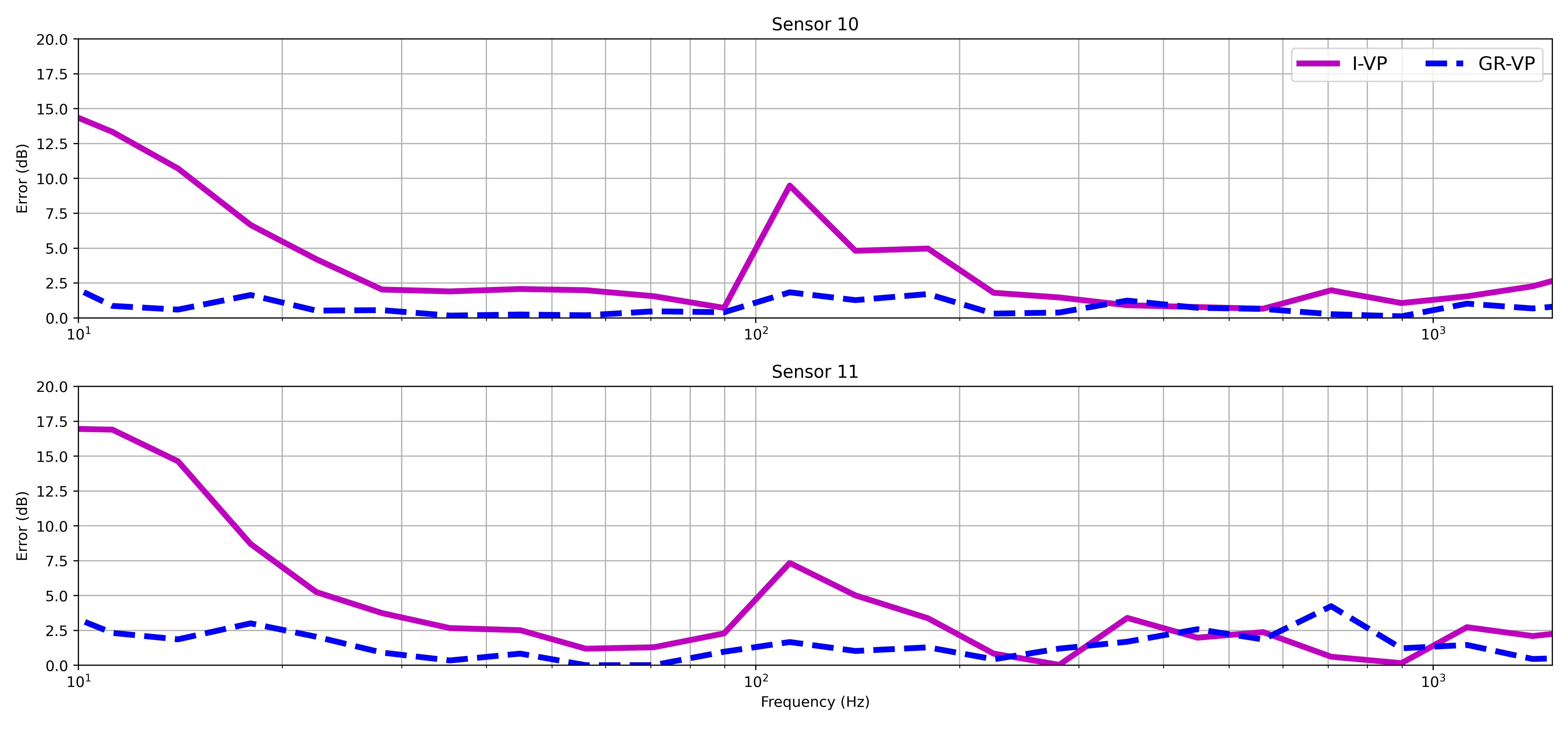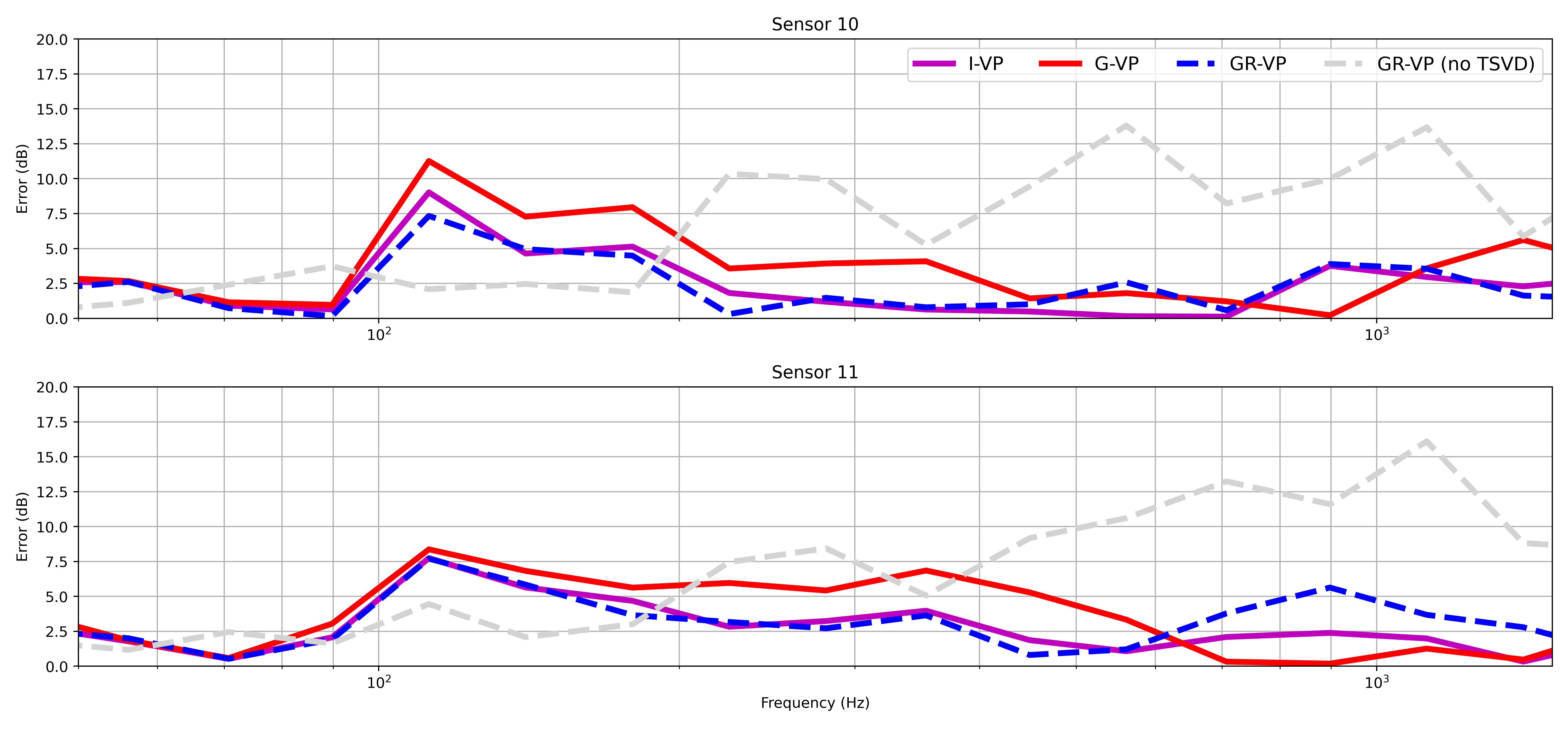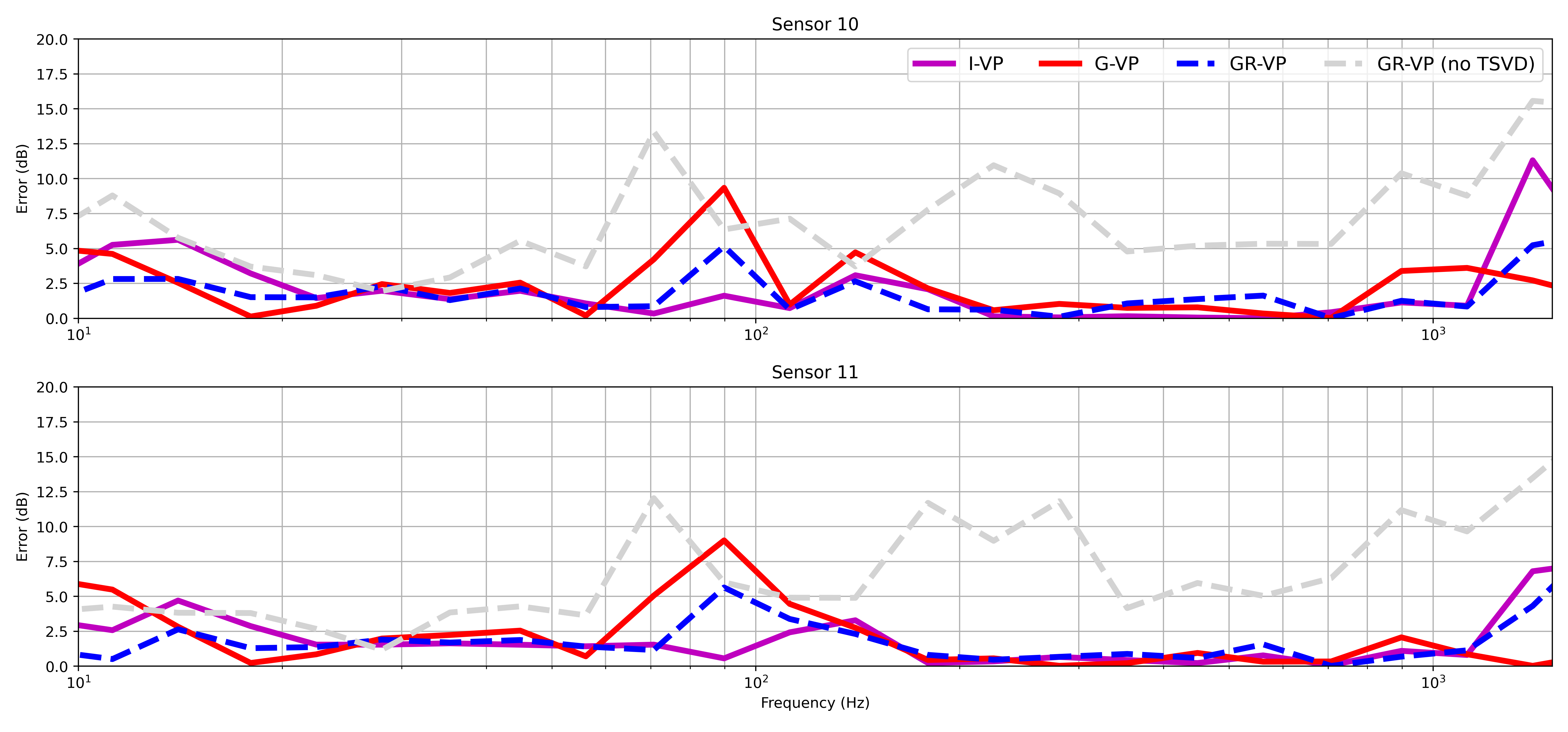Similar benefits where observed in the very low frequency range; where the conventional I-VP is overcome by noise floor issues, the GR-VP maintains a relatively low error (<3 dB). This is likely on account of the G-VPs being massively over-determined as compared to the I-VPs which use only local dynamics.