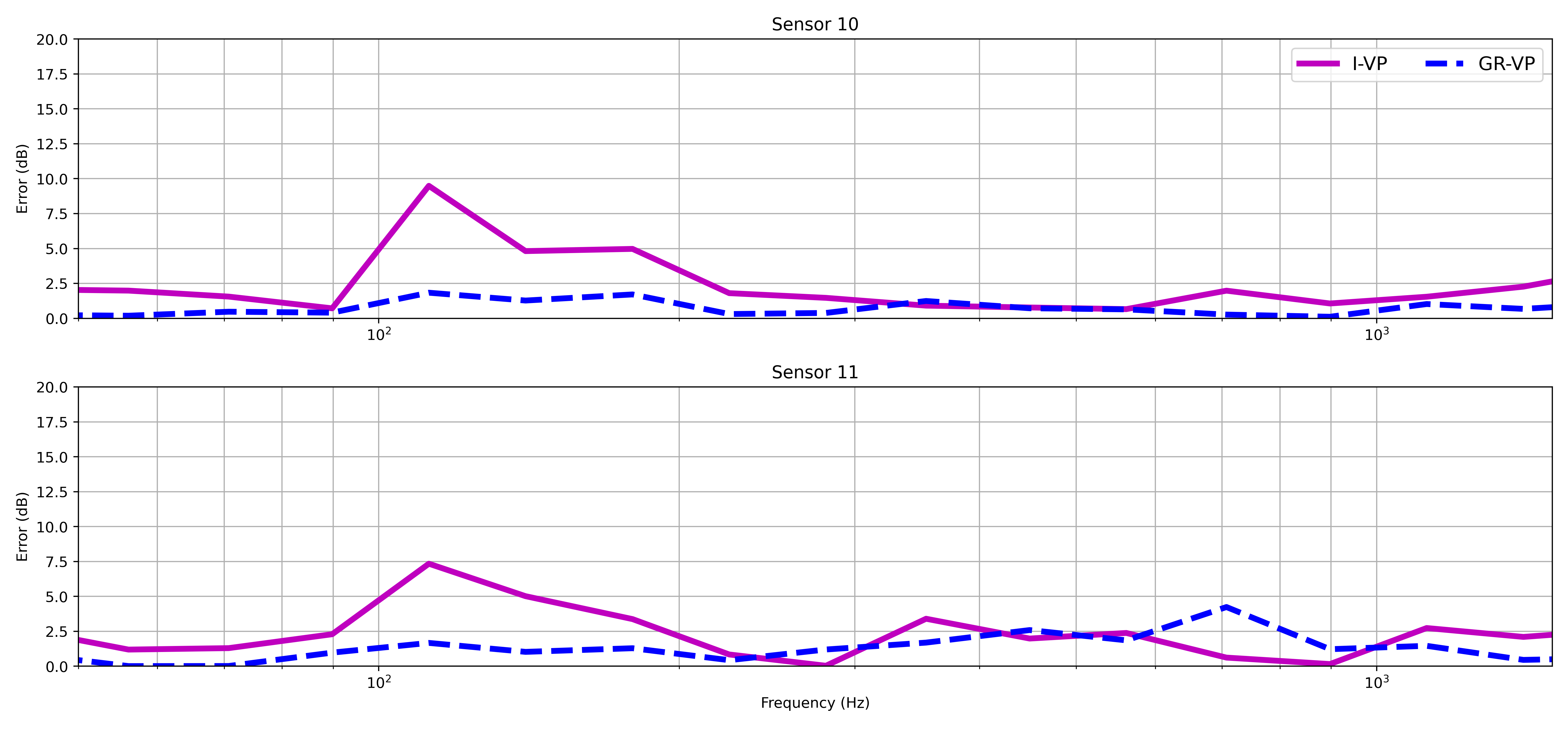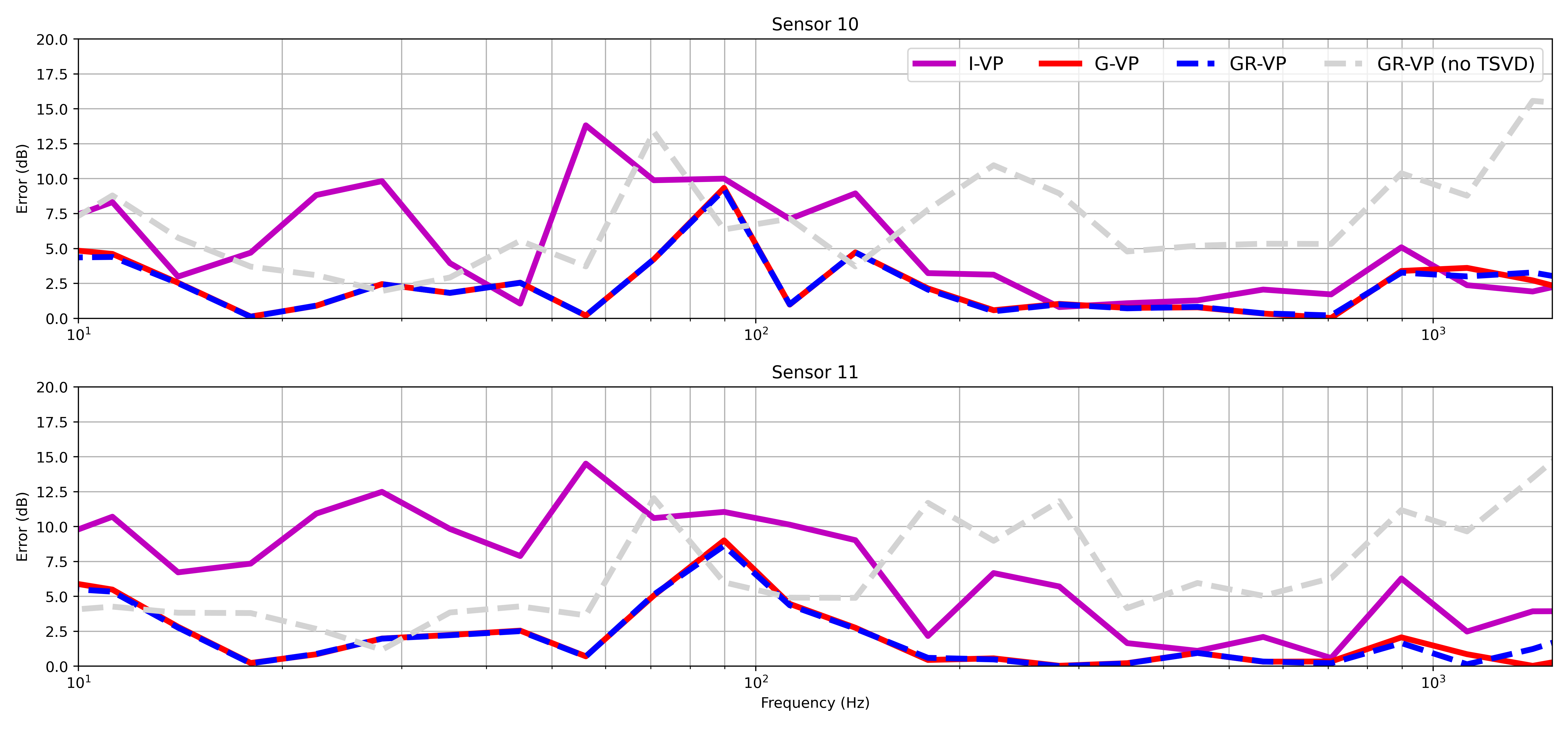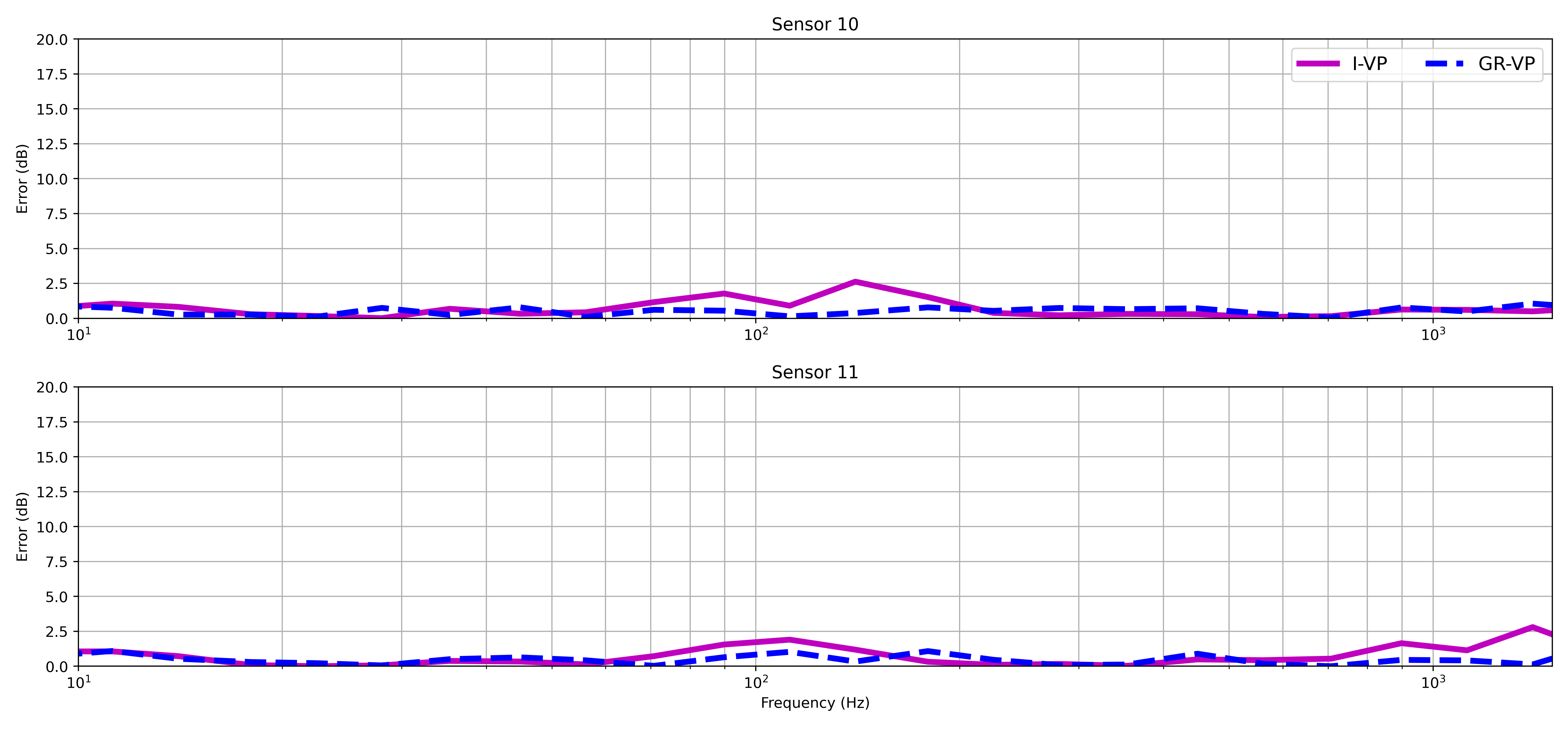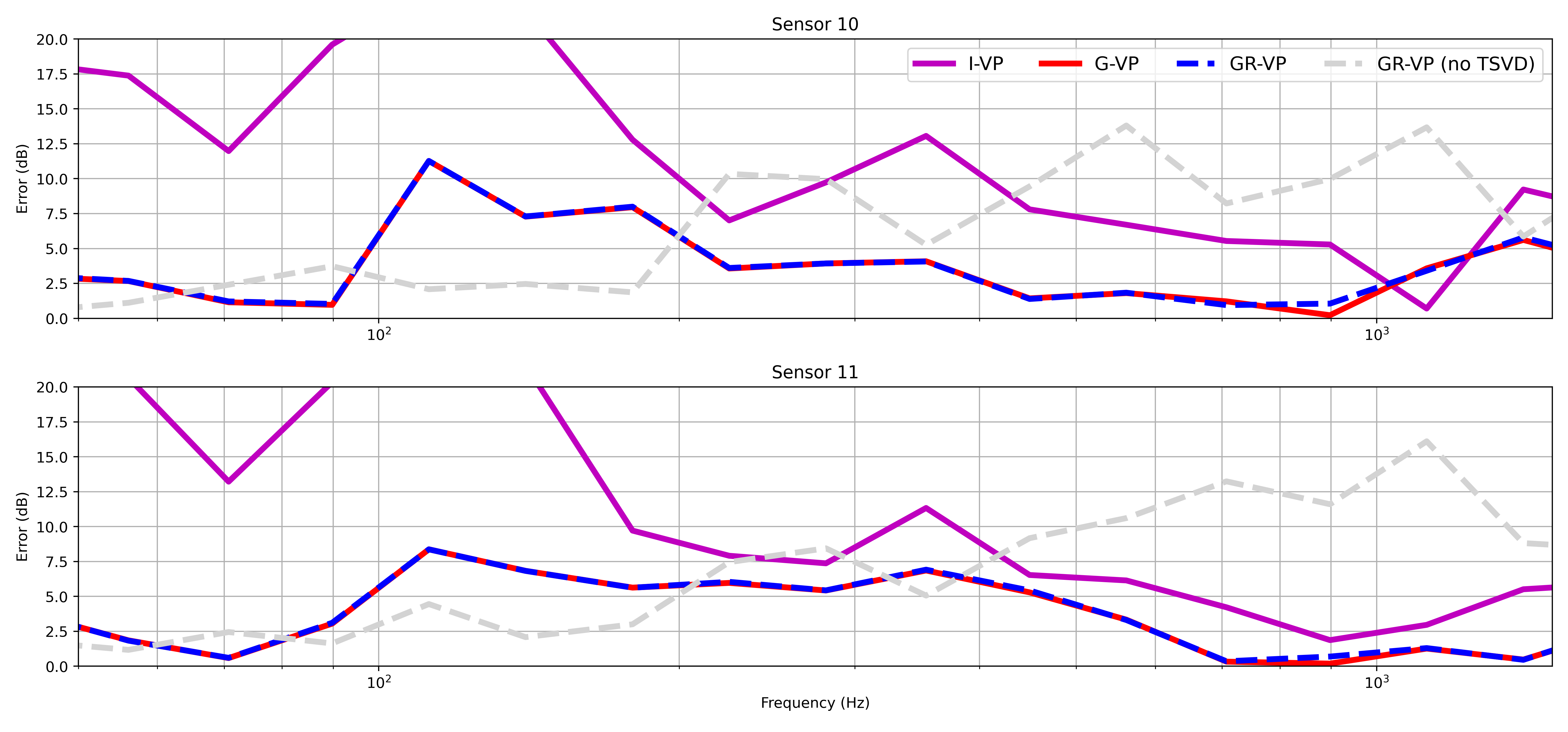 Similar benefits where observed in the very low frequency range; where the conventional I-VP is overcome by noise floor issues, the GR-VP maintains a relatively low error (<3 dB). This is likely on account of the G-VPs being massively over-determined as compared to the I-VPs which use only local dynamics.