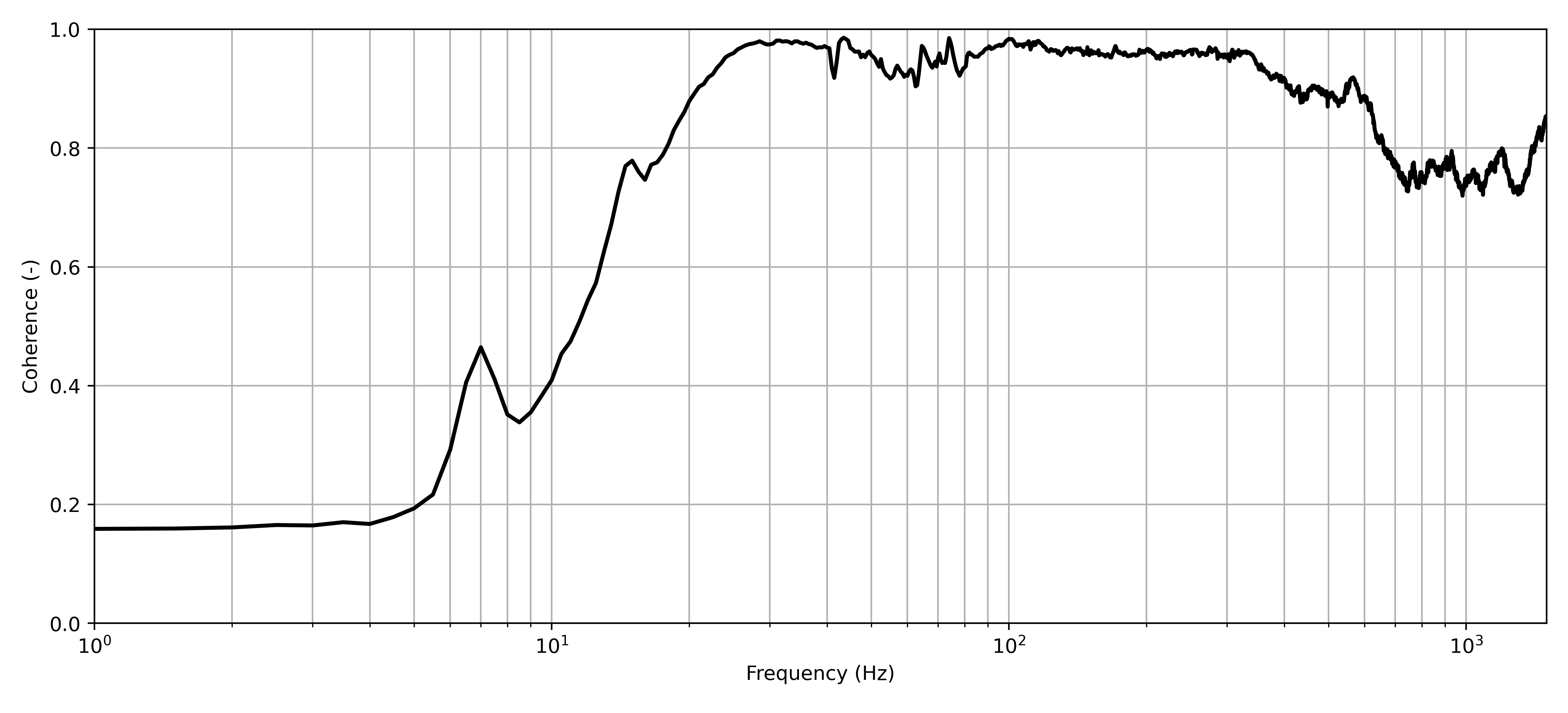 Figure 10: Average coherence across all measurements for rigidly mounted source. Useable frequency range: 50-1500 Hz.