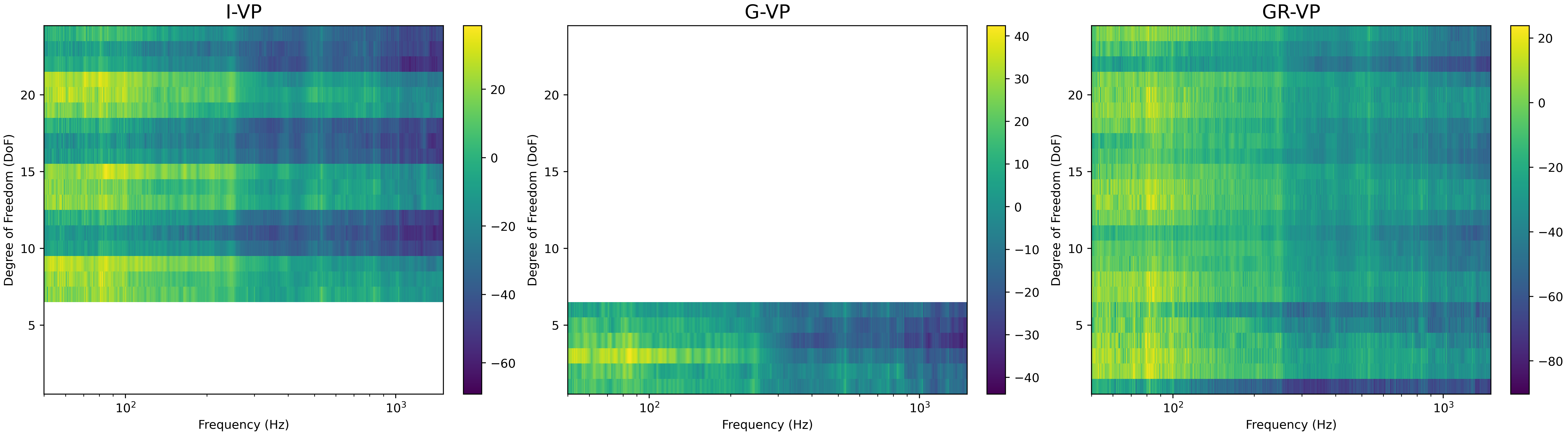 In the above we limited our frequency range to >50 Hz, on account of the noise floor dominating below this (see Figure 10). Inspecting the error plots below 50 Hz, as in Figure 20, illustrates a further potential benefit of the GR-VP representation. As expected, we see that the I-VP error increases significantly below \(50\) Hz, up to 17.5 dB at 10 Hz. The GR-VP error remains below 3 dB down to 10 Hz. The suspected reasons for this massive reduction in error are two fold: 1) the fact that the G-VP DoFs are estimated based on all interface measurements makes them massively over-determined, thus reducing sensitivity to error and b) the reduced matrix size as a result of the forward selection (i.e. retaining mostly just the G-VPs) reduces the amplification of uncertainty when the inverse is performed.