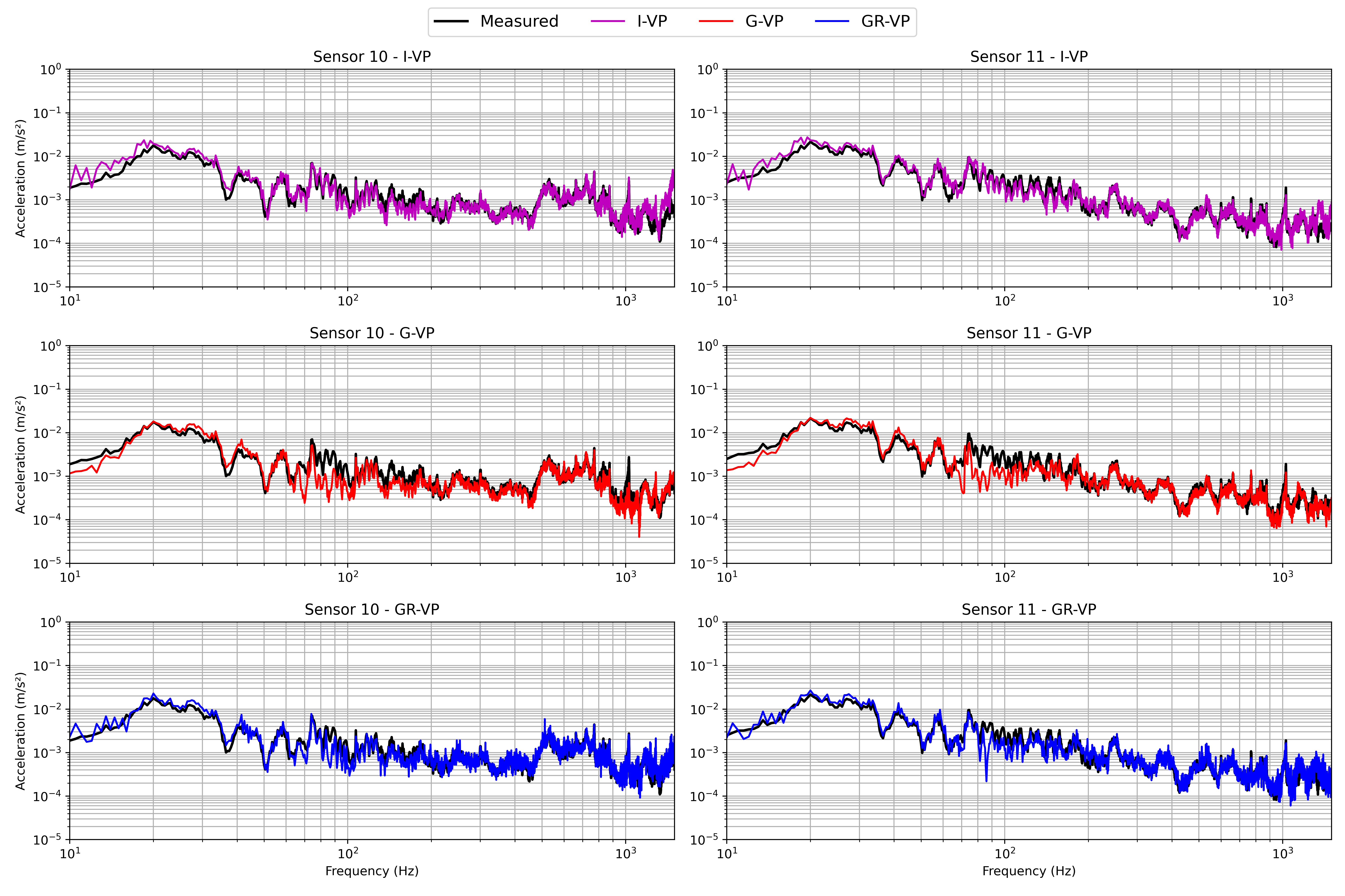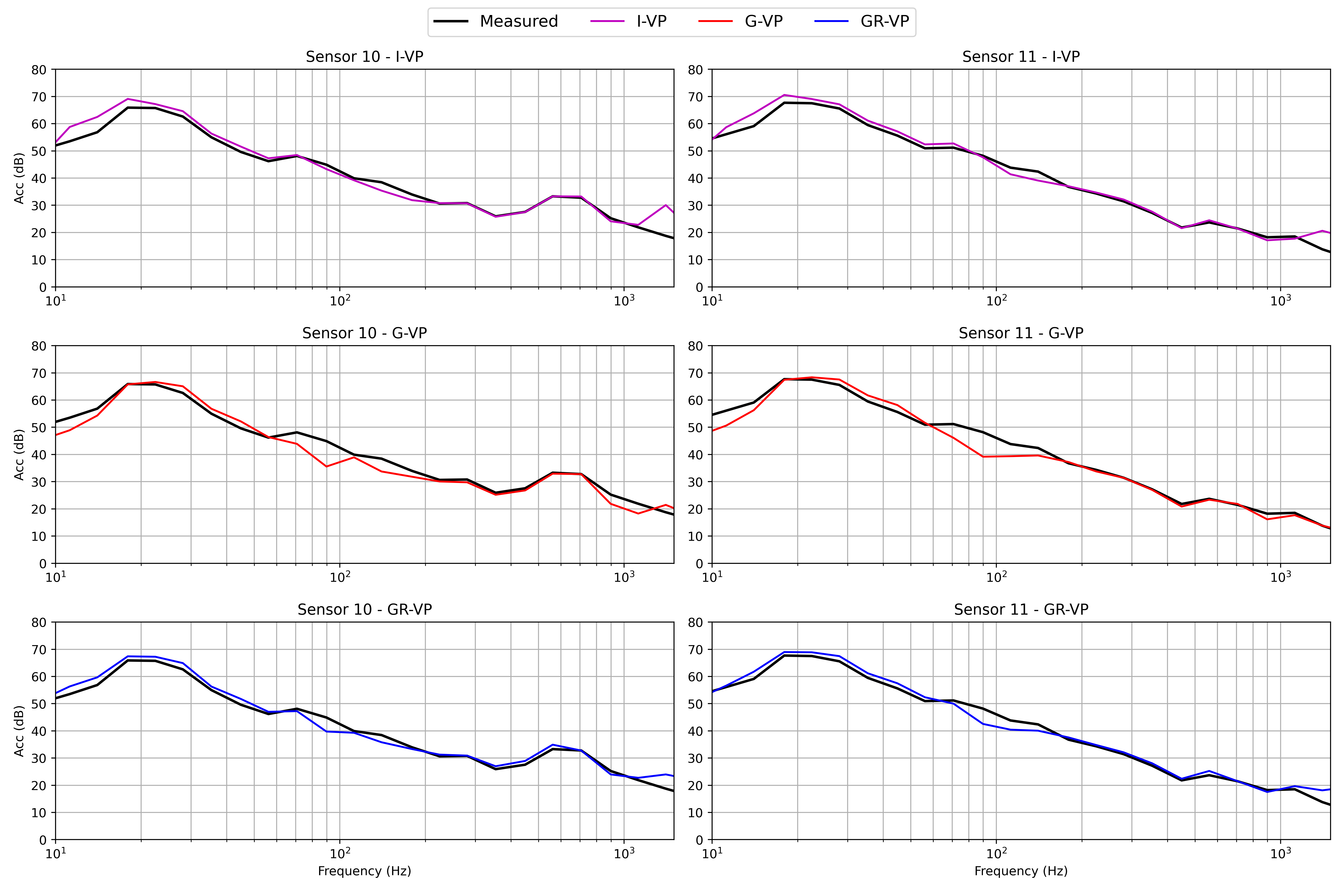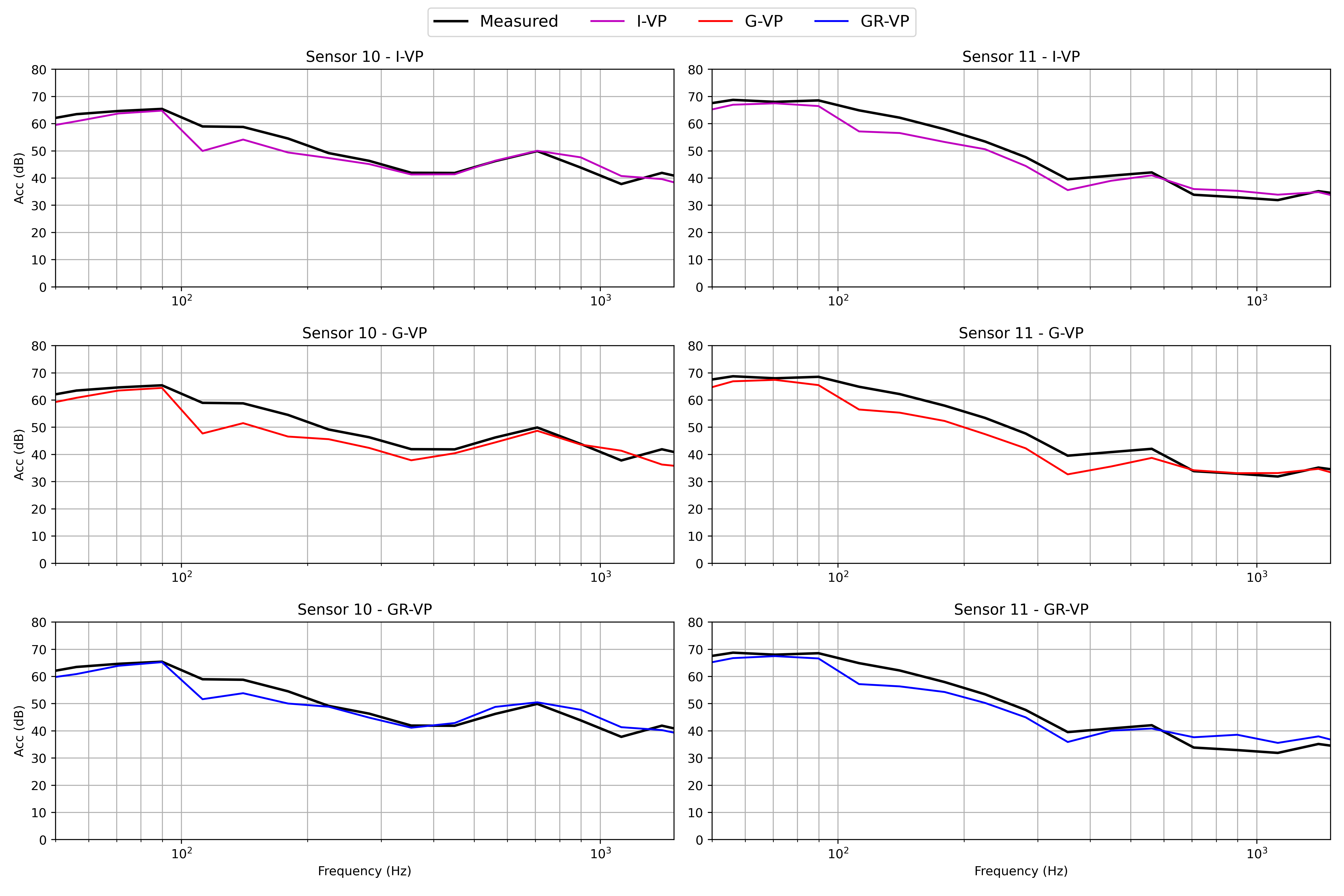 Figure 13: On-board validation results in 1/3rd octave bands for two remote sensors using each of the interface representations; individual VPs (I-VP top), global VP (G-VP middle) and global-residual VPs (GR-VP bottom).