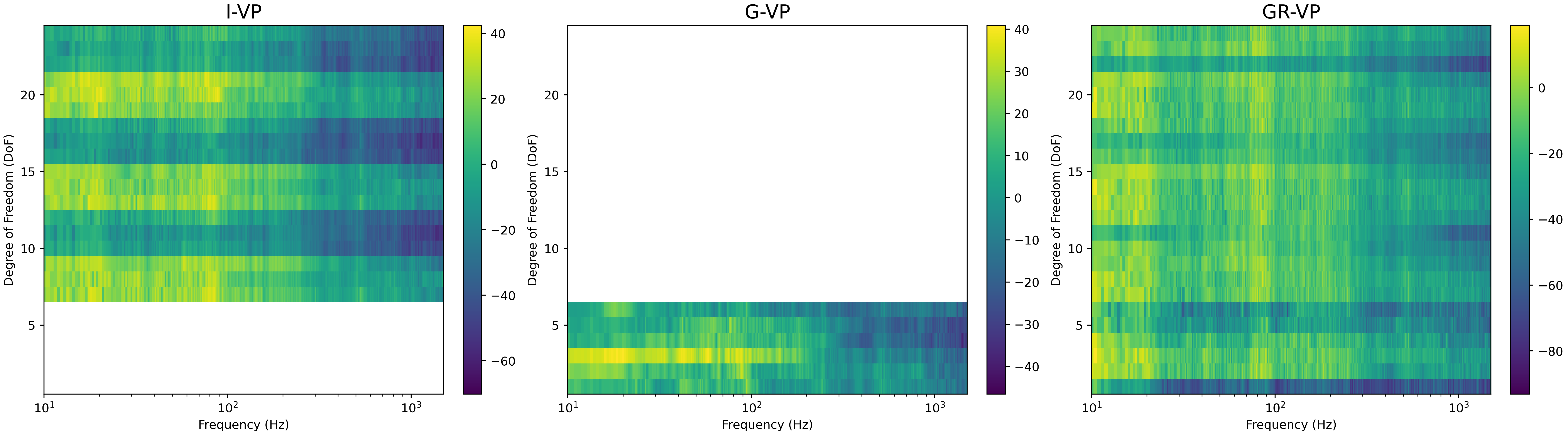 The rigid force maps bare some similarities to the resilient case in Figure 16, especially for the GR-VP case. For the I-VP we see some increased sparsity in the high frequency range with reduced sparsity in the frequency range. This reduction in sparsity at low frequencies is likely due to the rigid body dynamics occurring outside of the frequency range considered, i.e. within the noise floor.