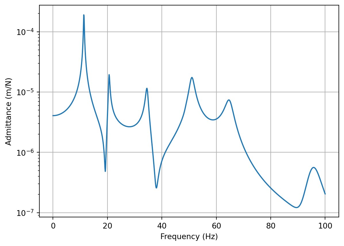 We begin by re-defining the mass and stiffness matrices \(\mathbf{M}\) and \(\mathbf{K}\) for the system in Figure 1 and computing the system FRFs for inspection purposes.