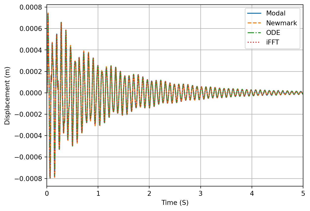 T =10# Total impulse time nsamp =10000# Number of samplesΔt = T/nsamp # Sample ratef_nq =1/dt/2# Nyquist limit (max FRF frequency)Δf = f_nq/nsamp # Frerquency resolutionf = np.linspace(0,f_nq,int(nsamp/2)) # Generate frequency arrayω =2*np.pi*f # Convert to radians# Direct solution:Y_C_dir_prop = np.linalg.inv(K +1j* np.einsum('i,jk->ijk',ω, C_prop) - np.einsum('i,jk->ijk',ω**2, M))doubleSidedH = np.hstack((Y_C_dir_prop[:,0,5], np.flip(Y_C_dir_prop[1:,0,5].conj()))) # Build double sided spectrumu_FFT =1/Δt * np.real(sp.fft.ifft(doubleSidedH))fig, ax = plt.subplots()ax.plot(t, x[5,:],label='Modal')ax.plot(t, u_NM[5,:],'--',label='Newmark')ax.plot(t, u_ODE[5,:],'-.',label='ODE')ax.plot(t[0:-1], u_FFT[:],':',label='iFFT')ax.grid(True)ax.set_xlabel('Time (S)')ax.set_ylabel('Displacement (m)')ax.set_xlim([0,5])plt.legend()plt.show()
