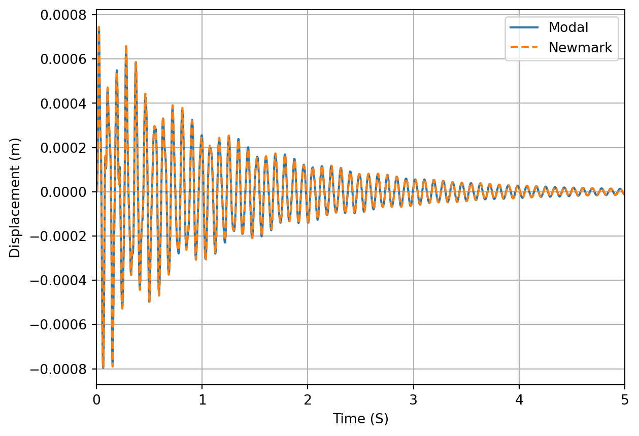 # Define Newmark functions:def newmarkImp(M, C, K, L, dt, e, gamma=0.5, beta=0.25, type='initForce'): ndof = M.shape[0] # Number of DOFs tSteps =int(L/dt)iftype=='initForce': # Initial force applied by acceleration IC Pj = np.zeros((ndof,)) Pj[e] =1 u = np.zeros((ndof, tSteps)) ud = np.zeros((ndof, tSteps)) udd = np.zeros((ndof, tSteps)) udd[:, 0] = np.linalg.inv(M)@Pj*2/dt f = np.zeros((ndof, tSteps)) f[e, 0] =0eliftype=='stepVel': # Initial force applied by equivalent initial velocity IC Pj = np.zeros((ndof,)) Pj[e] =1 u = np.zeros((ndof, tSteps)) ud = np.zeros((ndof, tSteps)) udd = np.zeros((ndof, tSteps)) ud[:, 0] = np.linalg.inv(M)@Pj udd[:, 0] =-np.linalg.inv(M)@C@ud[:, 0] f = np.zeros((ndof, tSteps)) f[e, 0] =0eliftype=='secondForce': # Dirac force at second time step Pj = np.zeros((ndof,)) Pj[e] =1 u = np.zeros((ndof, tSteps)) ud = np.zeros((ndof, tSteps)) udd = np.zeros((ndof, tSteps)) f = np.zeros((ndof, tSteps)) f[e, 1] =1/dt t = np.linspace(0, L-dt, int(L/dt)) # Time array A = np.linalg.inv(M+gamma*dt*C+beta*(dt**2)*K) # Acceleration update matrixfor tn inrange(1, t.shape[0]): # Start loop at second time step# Prediction step:# Displacement prediction based on previous u, ud and udd u[:, tn] = u[:, tn-1]+dt*ud[:, tn-1]+(0.5-beta)*dt**2*udd[:, tn-1]# Velocity prediction based on previous ud and udd ud[:, tn] = ud[:, tn-1]+(1-gamma)*dt*udd[:, tn-1]# Acceleration prediction based on current u and ud udd[:, tn] = A@(f[:, tn]-K@u[:, tn]-C@ud[:, tn])# Correction step:# Displacement update using prediced udd u[:, tn] = u[:, tn]+dt**2*beta*udd[:, tn]# Velocity update using prediced udd ud[:, tn] = ud[:, tn]+dt*gamma*udd[:, tn]return u, ud, udd# %% Define system parameters and initial conditionsndof =8# Number of DoFsu_NM, ud_NM, udd_NM = newmarkImp(M, C_prop, K, T, dt, 0, gamma=0.5, beta=0.25,type='stepVel')fig, ax = plt.subplots()ax.plot(t, x[5,:],label='Modal')ax.plot(t, u_NM[5,:],'--',label='Newmark')ax.grid(True)ax.set_xlabel('Time (S)')ax.set_ylabel('Displacement (m)')ax.set_xlim([0,5])plt.legend()plt.show()